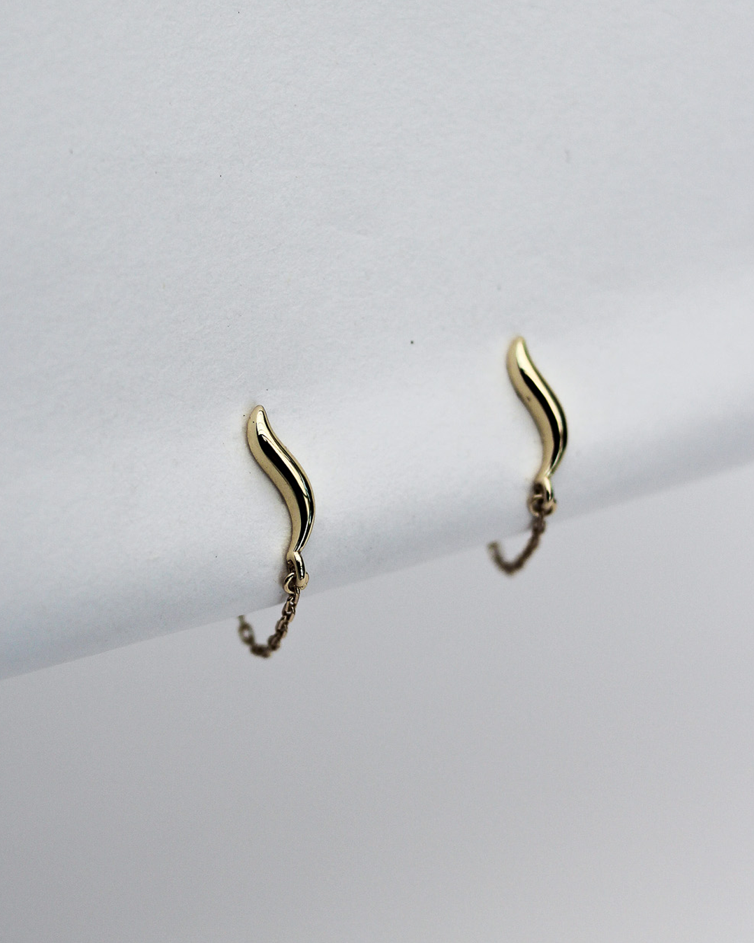 The Wave Chain Stud Earrings feature a fine curb chain attached to our wave shape stud to wrap around the ear lobe and secure to the butterfly clip backing.