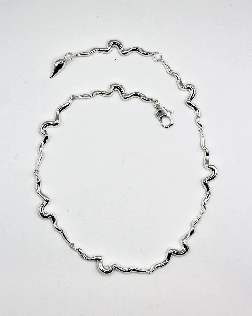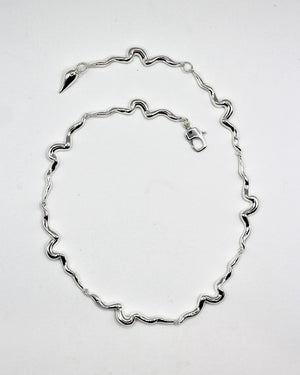 The Offbeat Neck Collar celebrates handcrafted form with it's wonky links joined to create an artistic statement necklace. The droplet tag detail also looks great when styled to the front for versatility.