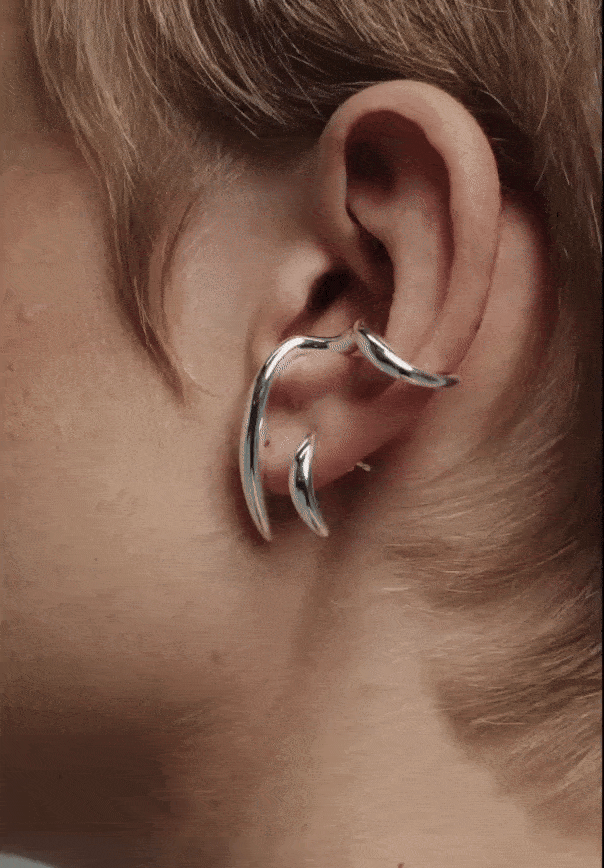 To wear this piece we suggest first securing the earring post into your lobe and then positioning the earring in place.