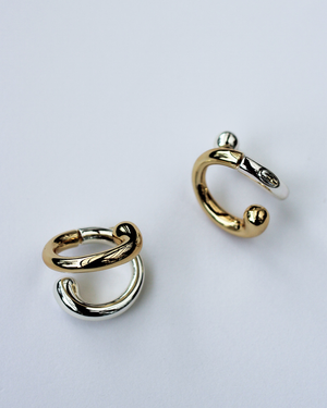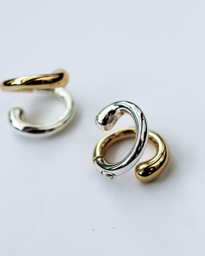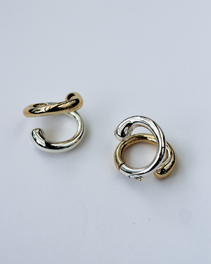 Our Double Trouble Hoop Earrings are two-toned hoop earrings plated in both 18K gold and sterling silver with a modern sculptural design.