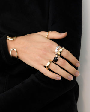 The Accord Gemstone Ring features a modern fluid design, with a cabochon onyx gemstone set in our over-sized claw setting Expertly crafted and designed, the Accord Gemstone Ring boasts a unique fluid design that highlights a captivating cabochon onyx gemstone. With an adjustable size feature, this ring is perfect for any occasion.
