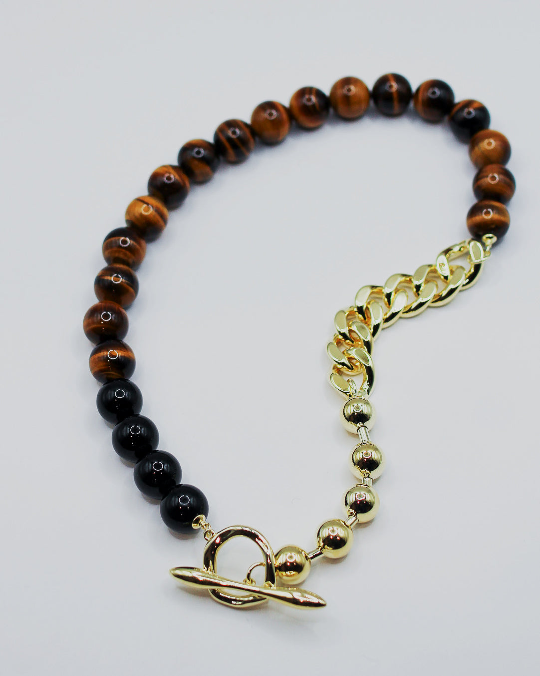 Experience the perfect blend of style and craftsmanship with the Primal Statement Necklace. Its intricate design incorporates contrasting statement chains, carefully crafted details, and stunning tiger's eye and onyx gemstones.