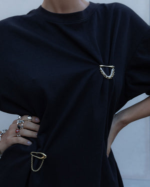 Bruce 链式耳钉采用方形链,固定在耳钉下方,环绕耳垂并固定在蝴蝶夹背衬上。