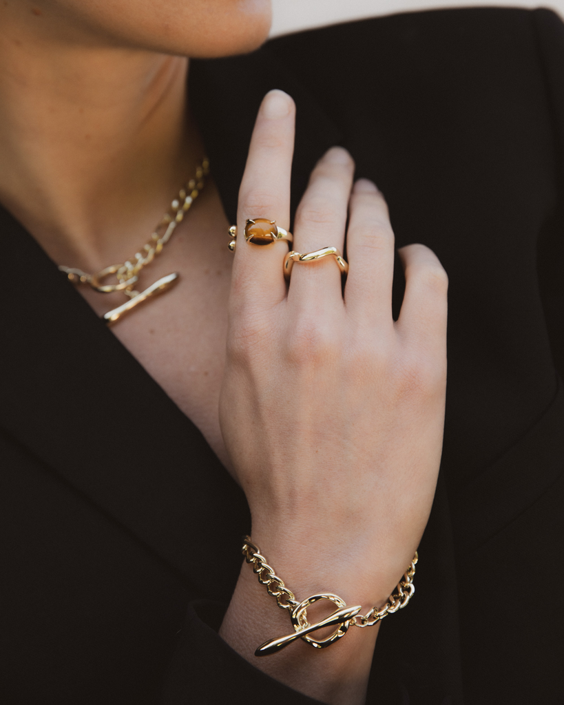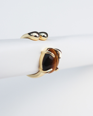 The Accord Gemstone Ring features a modern fluid design, with a cabochon tiger's eye gemstone set in our over-sized claw setting Expertly crafted and designed, the Accord Gemstone Ring boasts a unique fluid design that highlights a captivating cabochon tiger's eye gemstone. With an adjustable size feature, this ring is perfect for any occasion.
